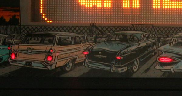 Pelin teema on 50-luvun drive-in elokuvateatteri, ja backboxin kuvassa on kekseliäästi tehty näytöstä