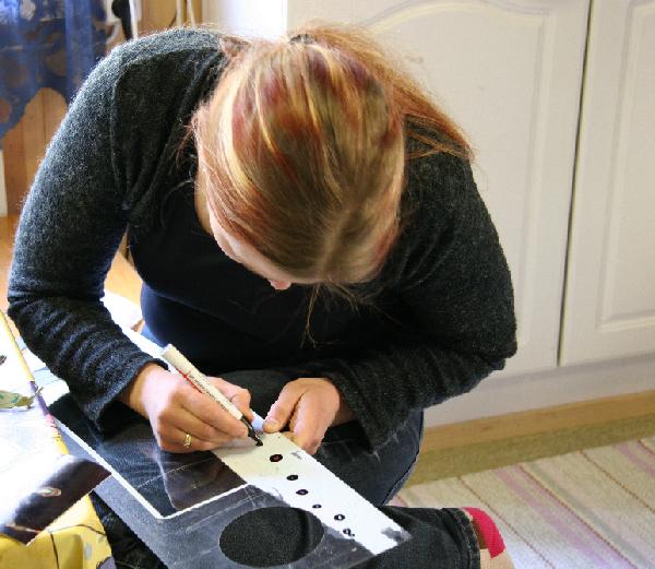Reikien kohdistamisessa auttaa voipaperista tehty sabluuna. Mustalla tussilla saa valon rajoitettua vain